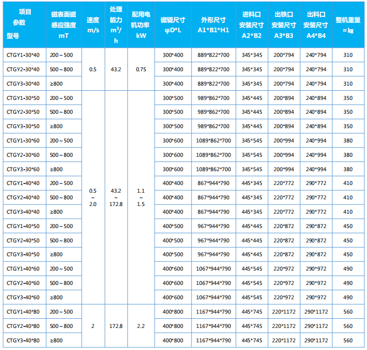 四、CTGY系列箱體滾筒式除鐵器(永磁磁輥)主要技術參數、外形尺寸